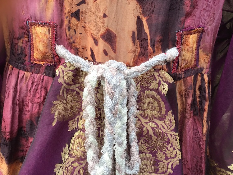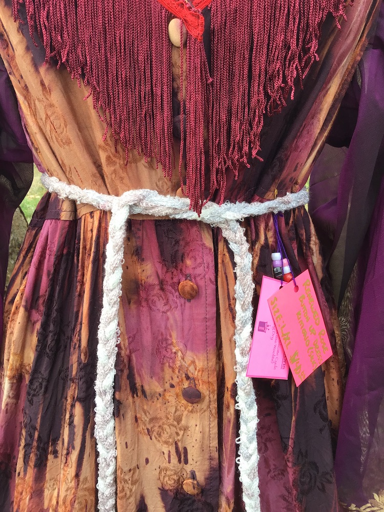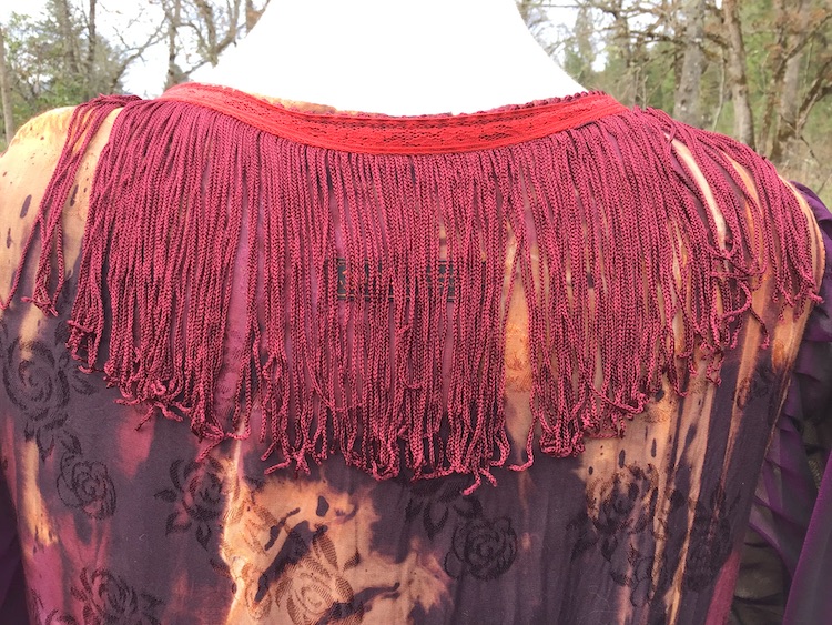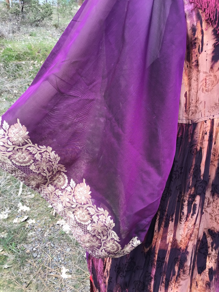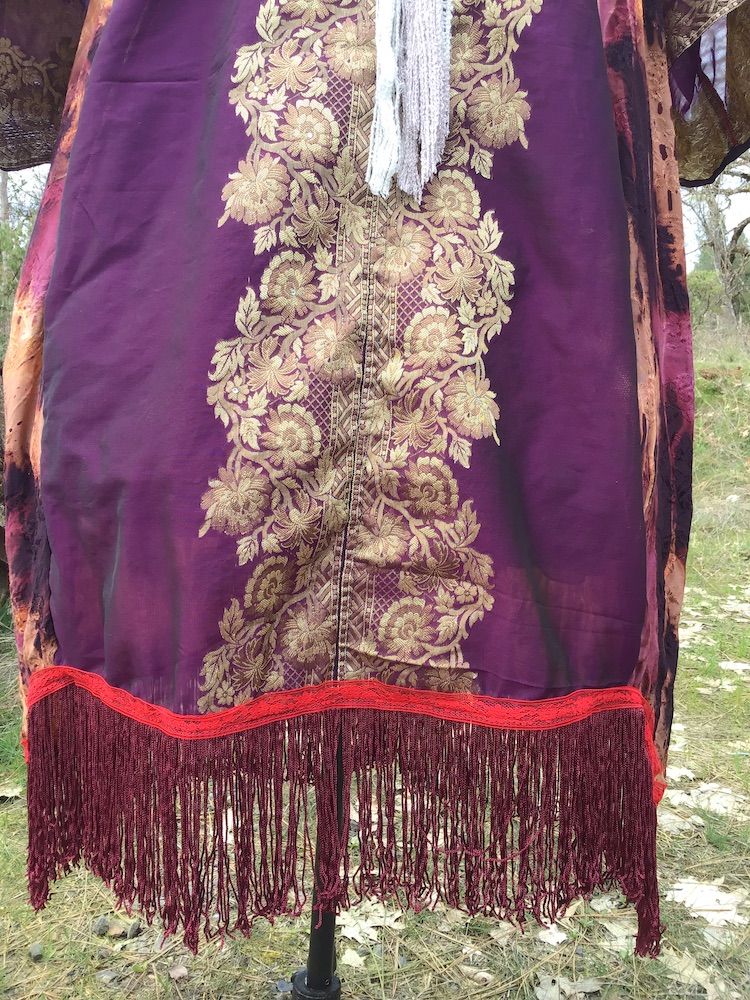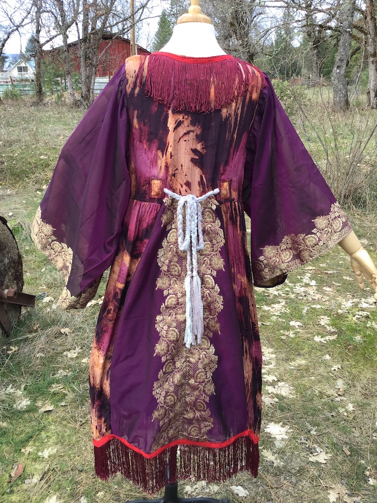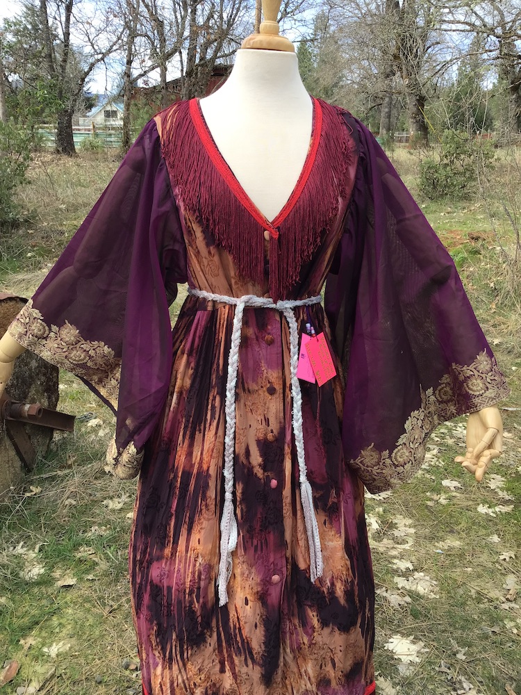 Indulge your inner love of luxury! The “Every Rose Has It’s Scorn” Kimono is a beautiful and one of a kind handcrafted garment composed mainly of silk, finished with thrifted and vintage notions/trims. Completely openable in the front via the line of buttons, it can be worn open or closed, for as much or as little coverage as one desires. Belt can be styled tied in the front or back for a variety of options. The purple silk fabric features absolutely stunning gold embroidery and delicate little gem appliqué that will require extra attention to care instructions for best preservation.
