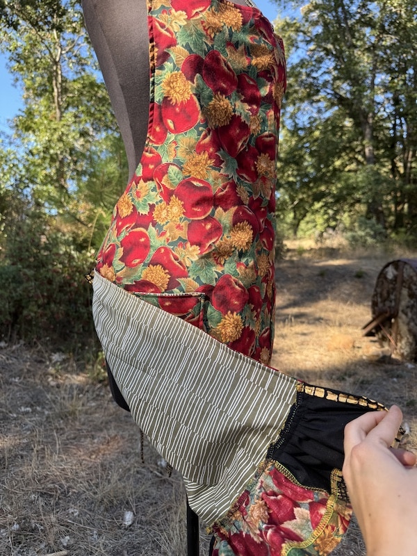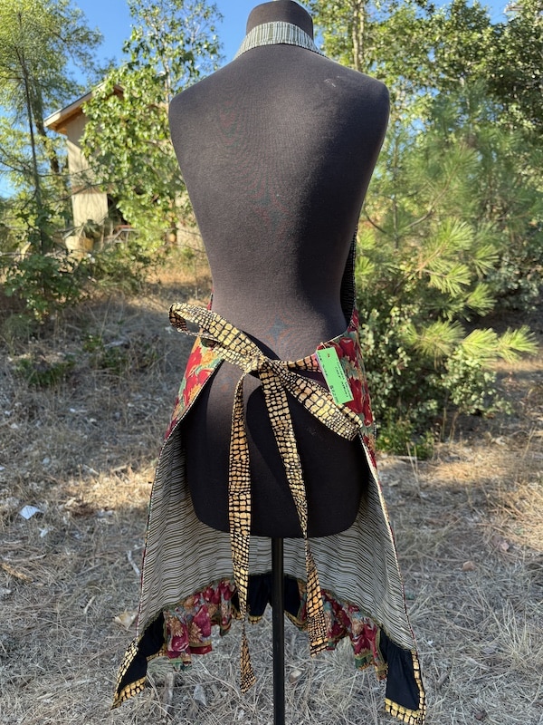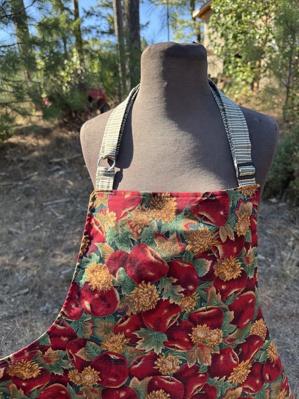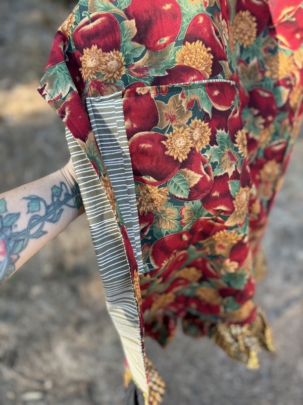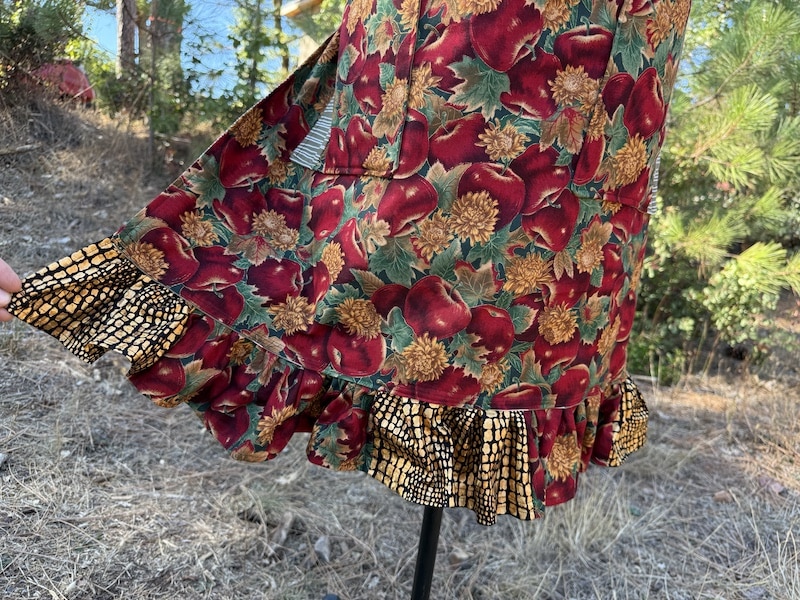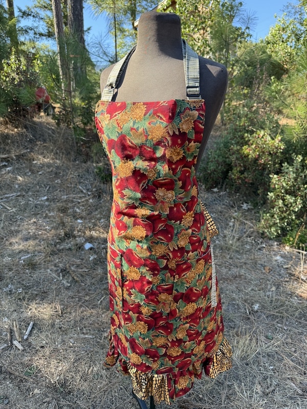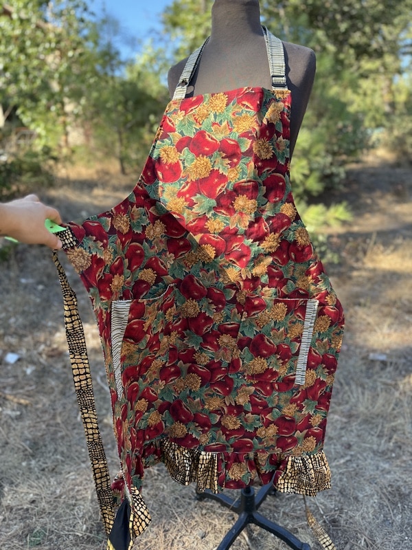 This charming chef’s apron is thoughtfully handcrafted from 100% cotton, and mainly features a vintage vibrant apple print mixed with complementing dead stock fabrics. One size and fully lined body for extra structure as well as comfort. The apron includes an adjustable neck strap for a customizable fit, and two roomy front pockets accented with subtle patchwork details that add character and charm. A soft ruffle trim along the bottom brings a touch of vintage-inspired whimsy, making this piece feel both nostalgic and fresh. From creating in the kitchen to hosting an event, this apron is a practical yet beautiful addition to your daily routine — and a perfect gift for anyone who loves textiles with a story!
