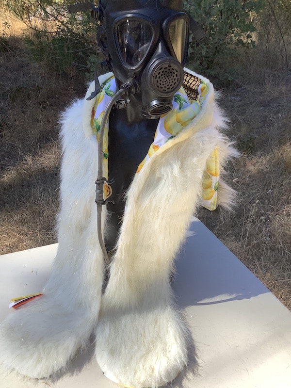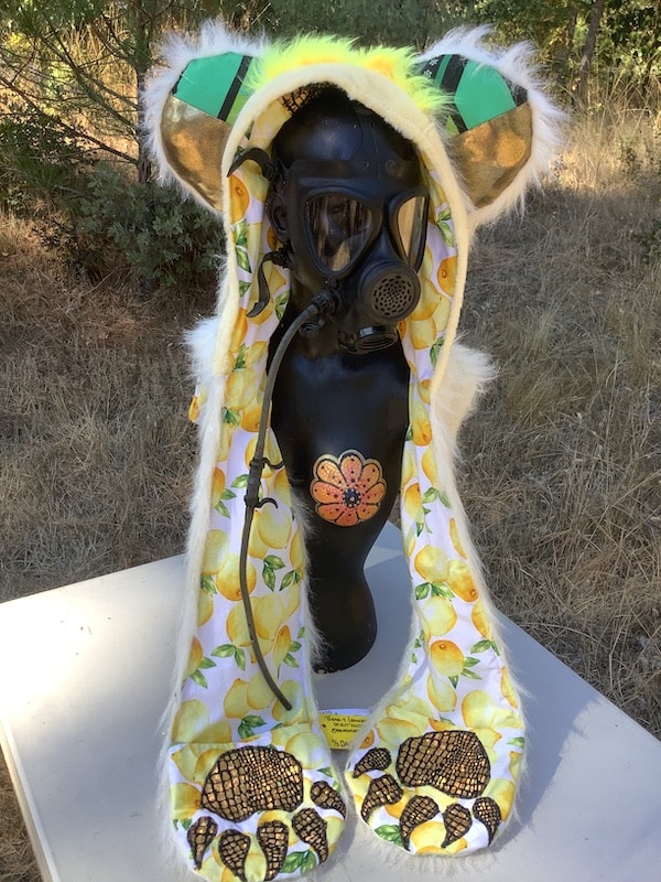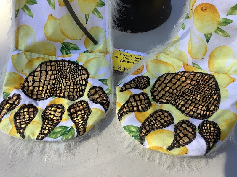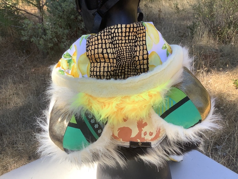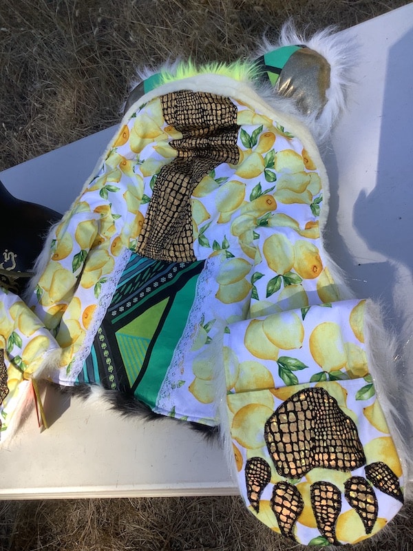 Crafted from white and gold flecked faux fur, the Lemon Panda Spirit hood envelops you in charismatic and snug comfort lined with lemon patterned white cotton. Whether you’re bundling up for a walk in the park, heading to a festive event, or simply looking to express your unique style, this hood is the perfect finishing touch. Our striking lemon panda design features an adorable center back panda appliqué which was sustainably repurposed from an old vintage sheet and the pockets feature metallic-gold speckled, black cotton fabric appliqué paws on the outer layer. Complete with oversized ears, and a cheerful yellow palette that is guaranteed to bring a burst of sunshine to any outfit!