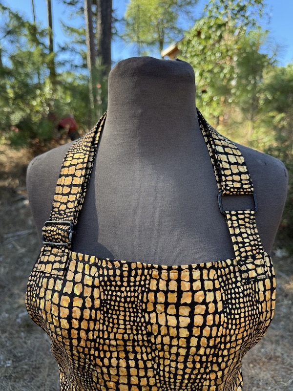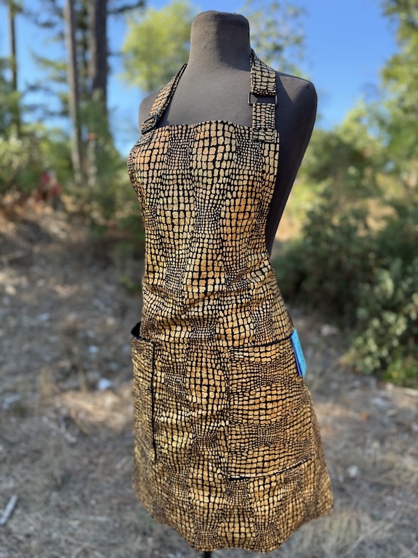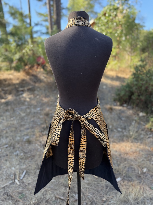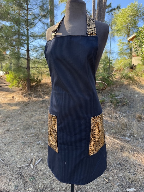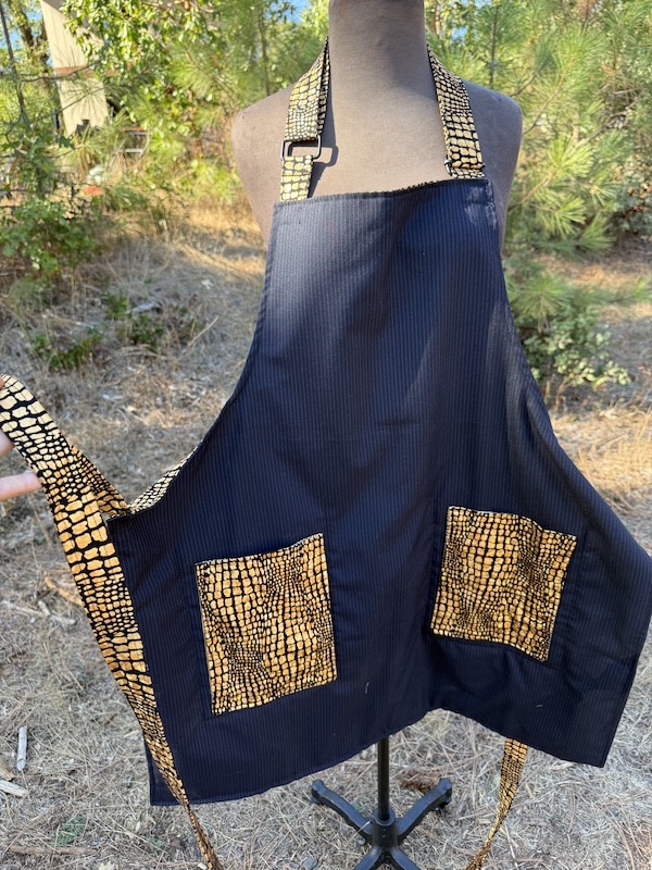 Crafted from high-quality dead stock fabrics- this one size, reversible chef’s apron offers two distinct looks in one stylish piece! 🪡✨One side features a bold black cotton flecked with gold for a striking and elevated look, while the reverse offers classic black pinstripes with complementing golden pockets for a more understated, professional vibe. Both sides include two practical front pockets, and the adjustable neck strap ensures a comfortable fit for most sizes. Finished with a limited-edition black and gold ©The Neon Odditorium tag (no longer available) this apron is as functional as it is collectible! Durable, one of a kind, and incredibly bold, it’s a standout piece for anyone who loves a touch of practical gold. ⚜️